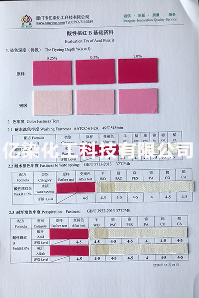 廈門市億染化工科技有限公司是一家集研發(fā)、生產、銷售一體的綜合型企業(yè)。公司主要經營:酸性染料、金屬絡合染料、高牢度分散染料及印染助劑。公司信守“以誠信贏合作、以質量贏市場、以創(chuàng)新贏發(fā)展、以服務贏生存”的企業(yè)精神服務于廣大客戶,多年以來建立了良好的市場口碑,市場遍布福建、廣東、浙江、江蘇、山東及東南亞國家,與多家知名企業(yè)建立了長期合作伙伴關系!
